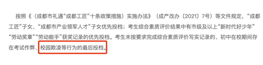 近几年,多地试图以刚性政策扭转颓势。比如,今年 3 月,四川省德阳市推出一项中考招生新政,将校园欺凌纳入初中毕业生综合素质评价体系,学生一旦认定为 " 校园欺凌 ",便无缘省级示范性普通高中。
