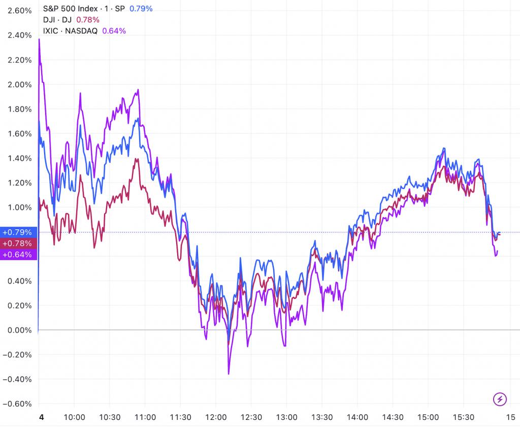 截至收盘,道琼斯指数涨 0.78%,报 40,524.79 点;标普 500 指数涨 0.79%,报 5,405.97 点;纳斯达克指数涨 0.64%,报 16,831.48 点。