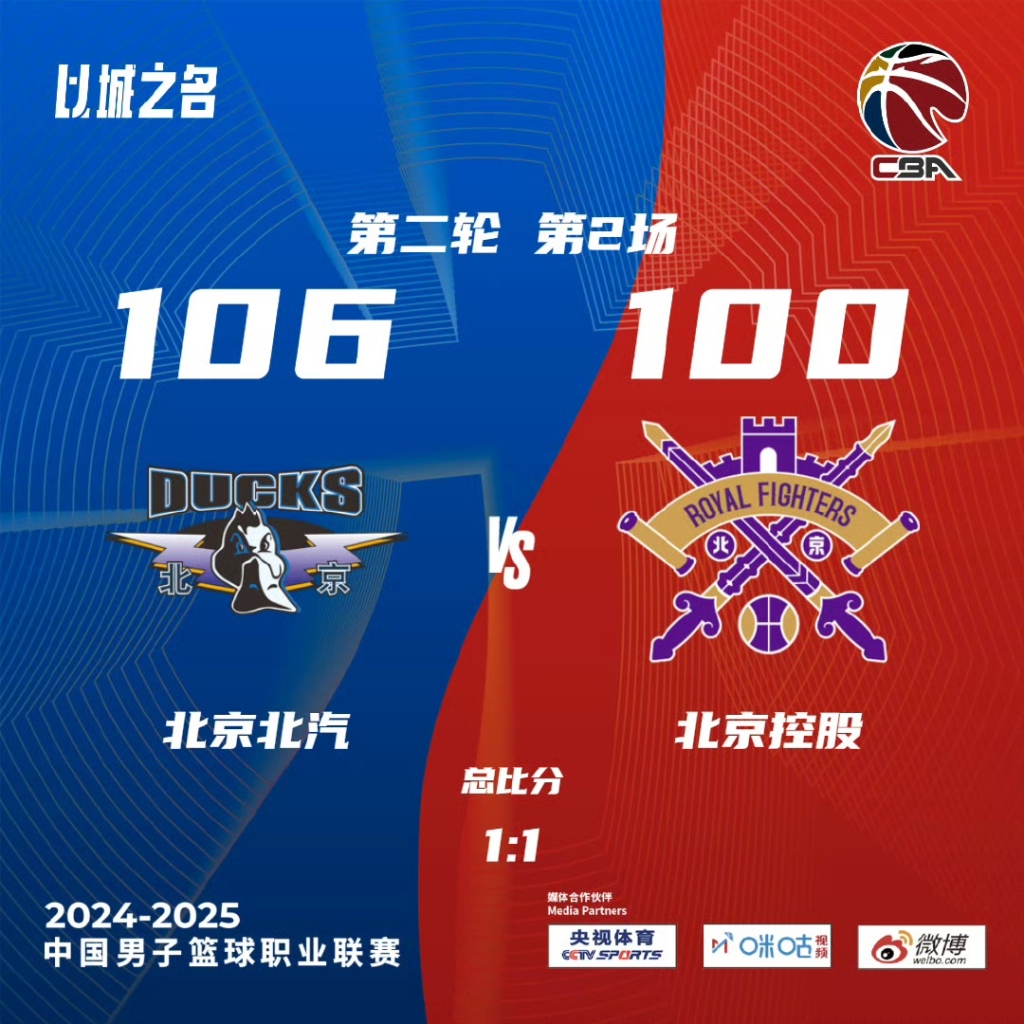 北京时间16日晚间,CBA季后赛四分之一决赛继续进行,北京队主场106比100击败北控队,将总比分扳为1比1平。