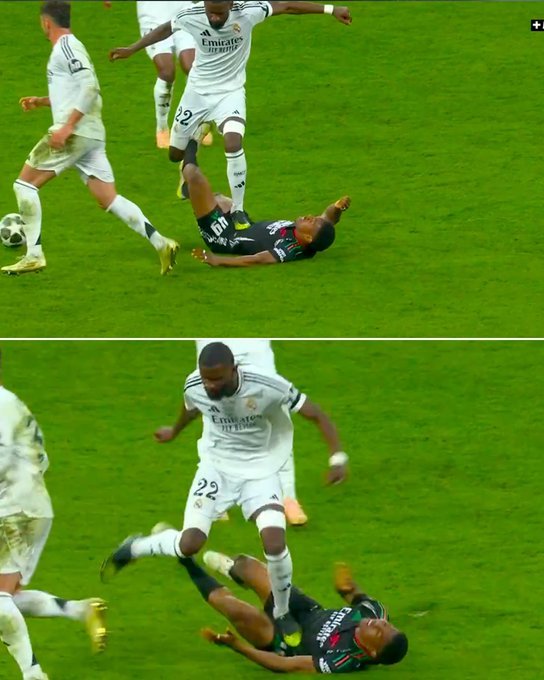 球场之外,皇马的小算盘没能得逞。球场上,他们的劣迹也被主裁漏过:吕迪格防守时放倒阿森纳球员斯凯利,紧跟着一脚踩在后者小腹上,但这个离谱的伤人动作,莫说被出示红牌,甚至逃过了VAR回看。