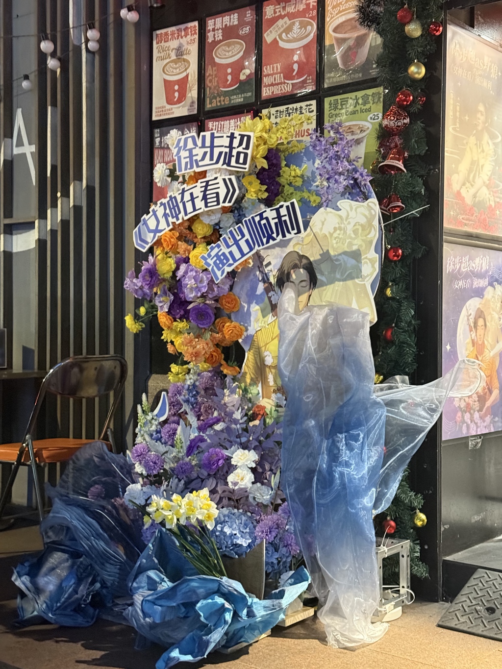 《桑塔露琪亚》的演出开始前夕,艺博和朋友约在亚洲大厦边上的分号咖啡吃饭。这里白天卖咖啡,晚上变身“分号小酒馆”卖酒,也提供小食,每逢有演出的时候,总是聚集了一批剧迷。店门口摆着音乐剧演员徐步超参演《女神在看》的应援牌,走进店里,还有粉丝自制的应援杯套可以取用,抬头看,天花板上贴了之前粉丝们留下的各种演员应援卡片。
