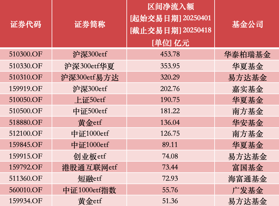 截至4月18日,澎湃新闻记者据Wind数据统计,全市场1143只可统计的ETF基金(场内,非货币型,下同)的月内资金净流入额合计为3005.28亿元。