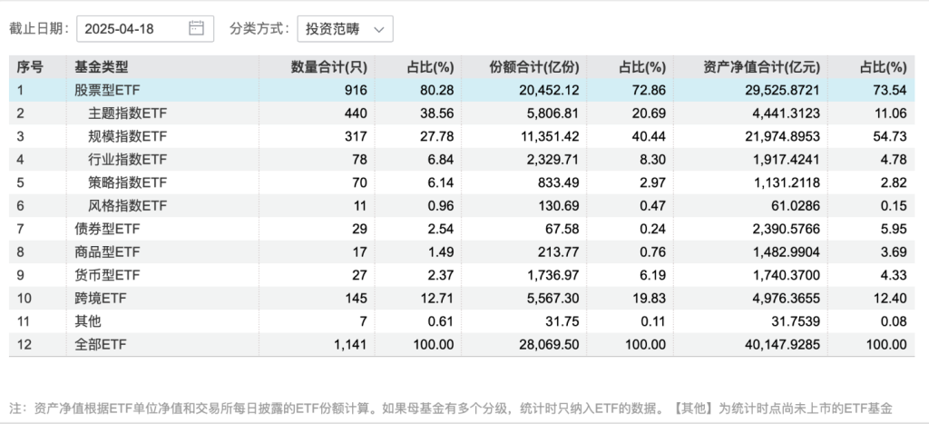 截至4月18日,ETF市场的最新规模达40147.93亿元。其中,股票ETF占据主导地位,最新规模为2.95万亿元,占比高达72.86%。跨境ETF、债券ETF、货币型ETF和商品型ETF的规模分别为4976.37亿元、2390.58亿元、1740.37亿元、1482.99亿元。