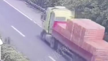轮胎在高速上滚动,一货车发现轮胎后,减速驶入应急车道,确认车辆情况。(轮胎在图片最左侧为主)网络截图。