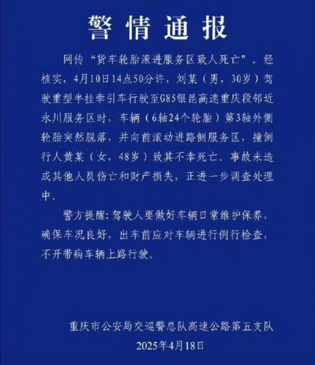 4 月 18 日,重庆市公安局交巡警总队高速公路第五支队对此事发布警情通报:经核实,4 月 10 日 14 点 50 分许,刘某 ( 男,30 岁 ) 驾驶重型半挂牵引车行驶至 G85 银昆高速重庆段邻近永川服务区时,车辆 ( 6 轴 24 个轮胎 ) 第 3 轴外侧轮胎突然脱落,并向前滚动进路侧服务区,撞倒行人黄某 ( 女,48 岁 ) 致其不幸死亡。事故未造成其他人员伤亡和财产损失,正进一步调查处理中。