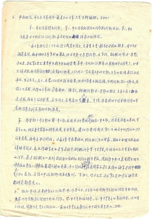 作者做了本专题的前一半工作,应该在这个基础上继续做后一半工作,前者是后者的基础,是有意义的,但后者是前者的研究成果,更为重要。建议作者……对本文进行 修改。这篇文章是有基础的,修改好了,可以发表。因为正如我与作者交谈时曾说过,在北洋海军史的建军过程中,购舰问题是一个关键。它涉及的不只是买几条船的问题,通过购舰可以看到清政府与帝国主义的相互关系,清政府中央决策集团与地方洋务派的关系;洋务派集团之间的关系;可以说明像中国这样的落后国家在建立民族的海军过程中走过什么道路,应该从中汲取那些历史教训。写好了,对近代史、近代军事史和近代海军史的研究都有意义。