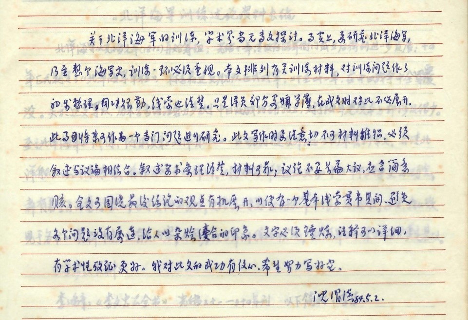升入大四后,开始酝酿毕业论文的选题。沈老师从大二时给我布置的海军史研究计划,我已做过多个专项研究,经与沈老师讨论,确定写“海军训练”专题。当时沈老师在我对这个专题撰写的资料长编上写下如此评语:
