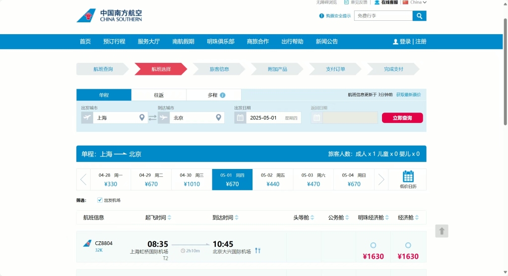 南方航空官网均有直飞机票在售