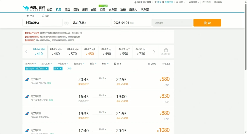 4月21日上午9时30分,澎湃新闻以上海飞北京为例,在去哪儿网上分别检索4月24日和5月1日的南航机票发现,去哪儿网只显示有转机机票,并无直飞机票。而记者通过南方航空官网查询,前述日期相同行程均显示有直飞机票在售。