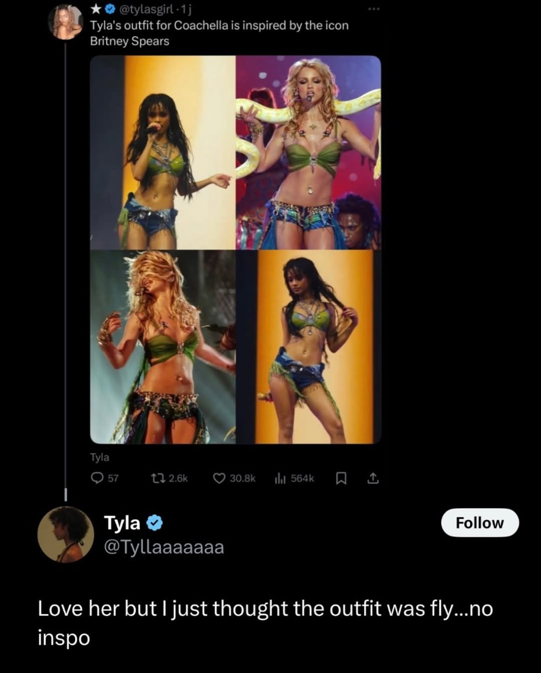 在粉丝将泰拉在科切拉音乐节上的装扮与布兰妮2001年MTV音乐录影带大奖的标志性装扮进行比较后,泰拉直言不讳。