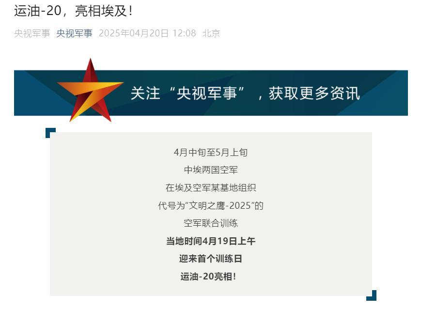 这个答案得到了中国空军的确认。根据中方发布的官方消息,当地时间 19 日上午,中埃 " 文明之鹰 -2025" 空军联合训练在埃及空军某基地迎来首个训练日,中方派出歼击机、预警机、加油机和直升机等力量参训。为确保参演装备与人员高效投送,中方采取 " 空转 + 空运 " 混合编组模式,经过多个国家,航程近 6000 公里,于 15 日完成全员全装进驻。此次联训是中埃两军首次组织联训。
