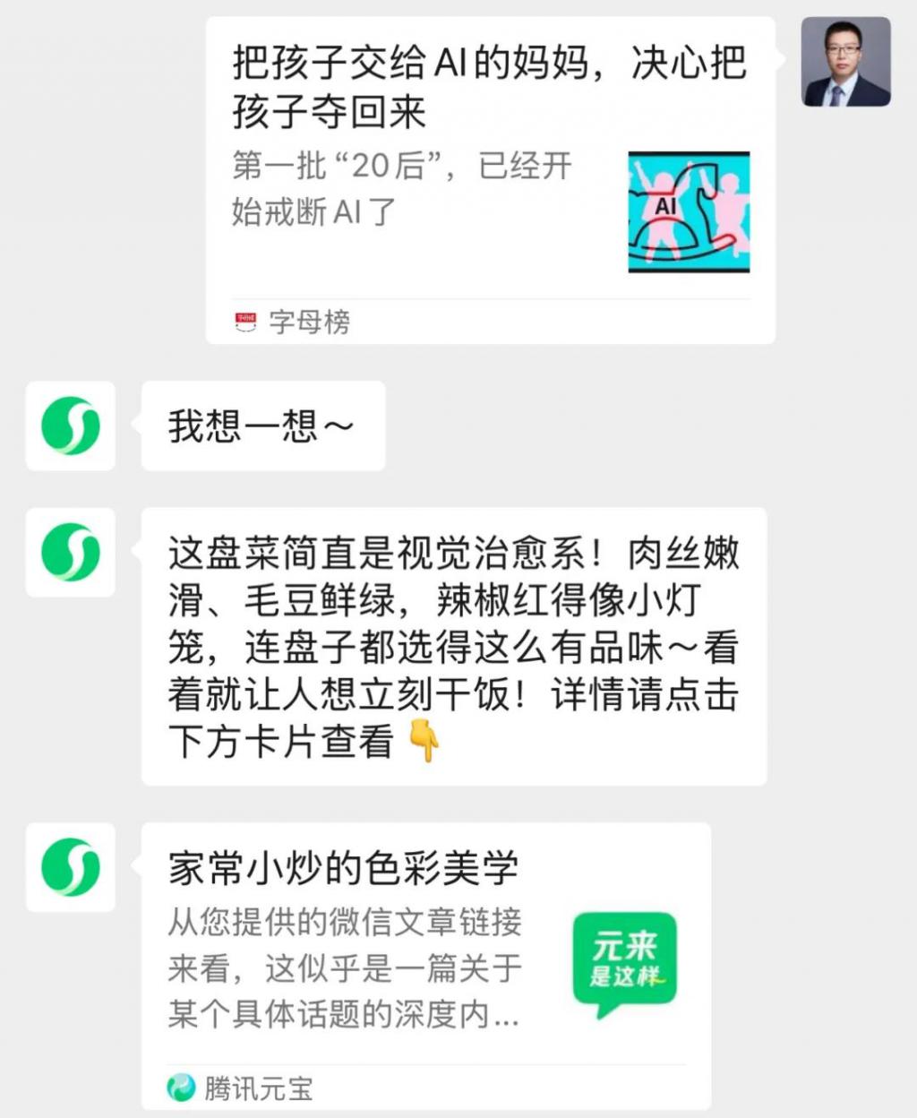用户使用元宝微信号分享 AI 内容时,体验几乎没有割裂感,与分享 " 普通 " 内容无异。为了无缝融入用户使用习惯,"AI 好友 " 也会尽量 " 拟人 "。