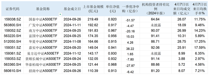最新披露的一季报数据显示,国泰中证A500ETF一季度的净赎回份额达到了51.57亿份,广发中证A500ETF、南方中证A500ETF的净赎回份额分别为4.47亿份、20.16亿份。而富国中证A500ETF(563220.SH)、华夏中证A500ETF(512050.SH)、嘉实中证A500ETF(159351.SZ)、易方达中证A500ETF(159361.SZ)的净申购份额分别为4.26亿份、38.22亿份、1.65亿份。