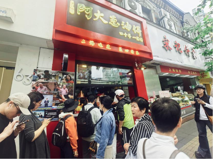 4 月 23 日上午十点,《新民周刊》记者前往位于石门二路的阿大葱油饼探店,从奉贤路刚拐到路口,就看到顾客排队队伍已到了街角。阿大吴根存正坐在门口的露营椅上,和慕名而来的顾客开心聊天,店内是儿子吴志勇和几个年轻伙计在忙碌。