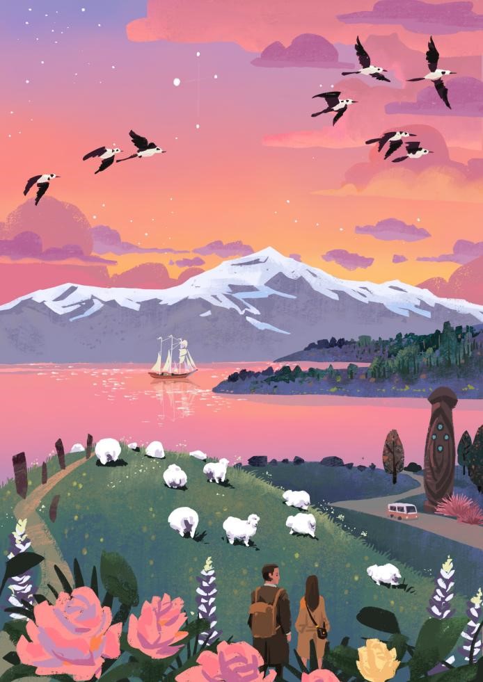 南太平洋里的那些由火山喷发形成的岛屿和地貌——我是指新西兰,飞在天上看,站在甲板上看,潜入碧蓝的太平洋波涛中看,抑或跟着一百年前的素描与蚀刻画看,总之,不论怎样看,最终都会赞叹世界的壮美与庄严。