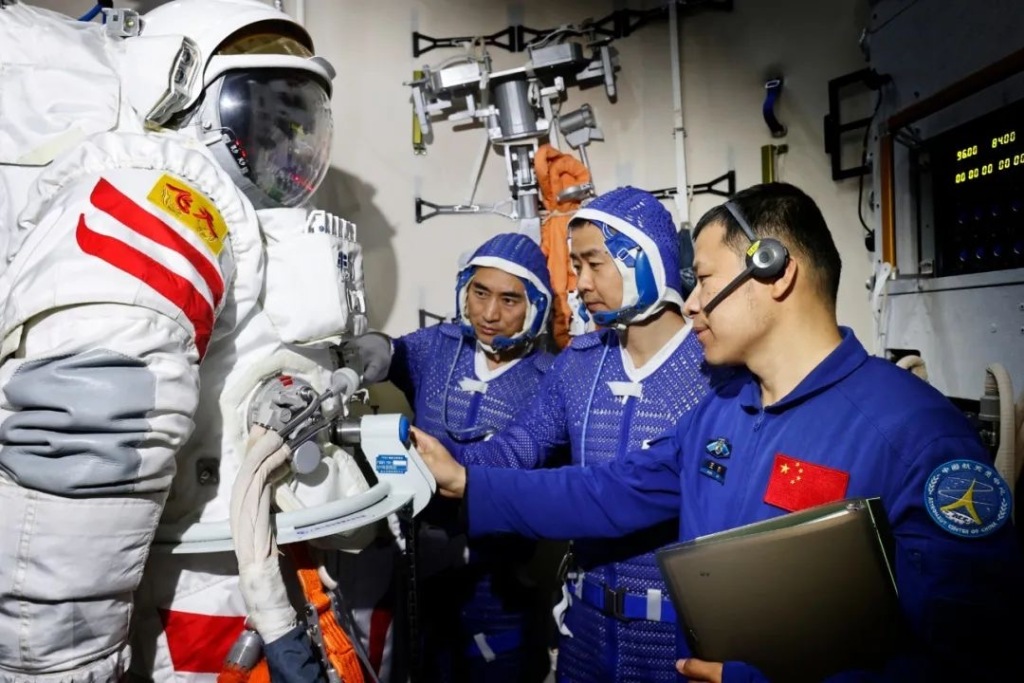 神舟二十号航天员乘组陈中瑞(左)、陈冬(中)、王杰进行出舱程序训练。