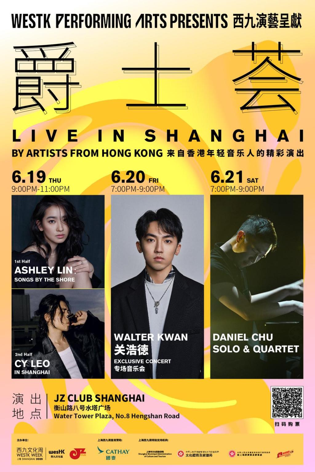 爵士音乐会“西九演艺献:爵士荟”将在上海最具代表性的爵士俱乐部JZ Club连续三晚上演。集中了多位在西九舞台大放异彩的香港年轻顶尖音乐人,展示香港音乐界的活力。包括香港唱作女歌手林恺铃(Ashley Lin)、曾夺得世界冠军的口琴演奏家何卓彦(Cy Leo)、唱作人关浩德(Walter Kwan)及即兴钢琴家朱肇阶(Daniel Chu)。