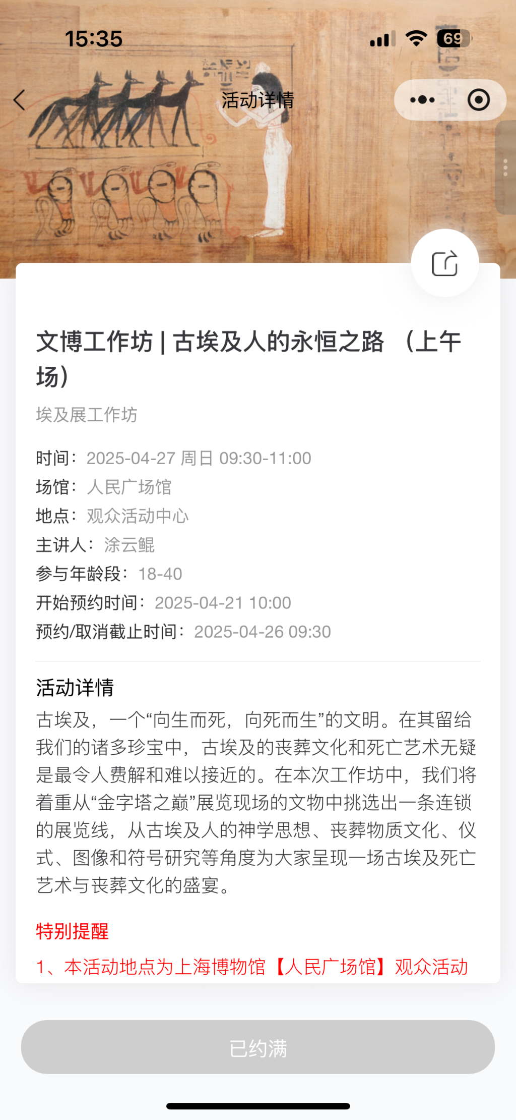 网友帖文配图显示,4月27日,上海博物馆有一项《古埃及人的永恒之路》文博工作坊活动,分上午和下午场,报名参与年龄均显示为18-40岁之间。
