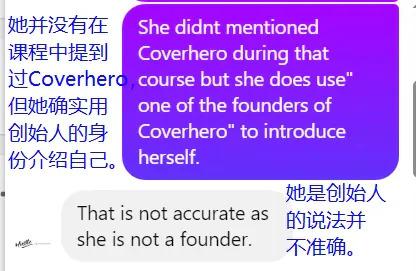 助教提供的讲师海报显示,Eva 老师是知乎知学堂 AI 项目负责人、前海外保险管理 App Coverhero 创始人之一、悉尼科技大学硕士。在这些身份中,描述最为详细的 " 前海外保险管理 App Coverhero 创始人之一 " 较容易验证。记者通过邮件等方式联系上 Coverhero 的创始人及 CEO Naby Mariyam,Naby 回复称:"Eva 在 2017 年曾在我们团队工作过,但她并不是创始人。我们从未授权她使用我们的品牌(来做宣传)。"