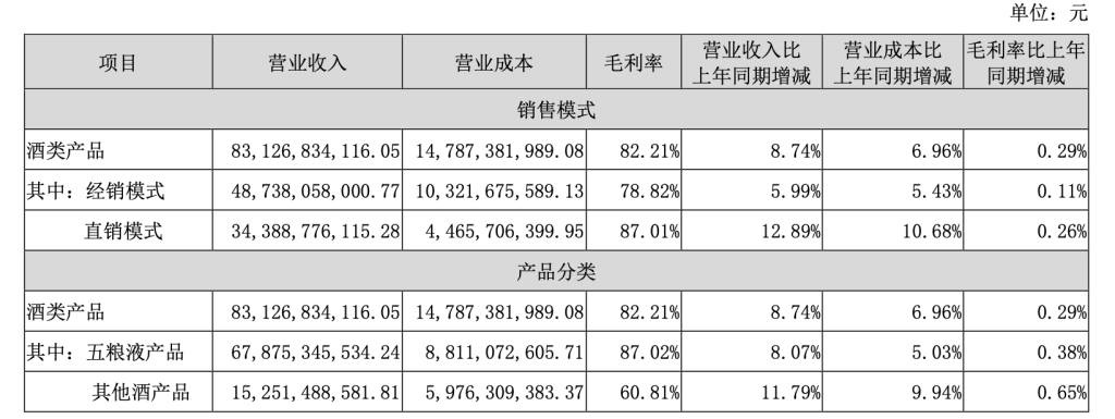 分模式来看,经销模式实现营收487.38亿元,同比增长近6%,毛利率为78.82%,同比提升0.11个百分点;直销模式实现营收343.89亿元,占比近四成,同比增长12.89%,毛利率为87.01%,同比增长0.26个百分点。五粮液经销商数量增长82家至2652家,五粮浓香经销商数量同比增加245至1059家。