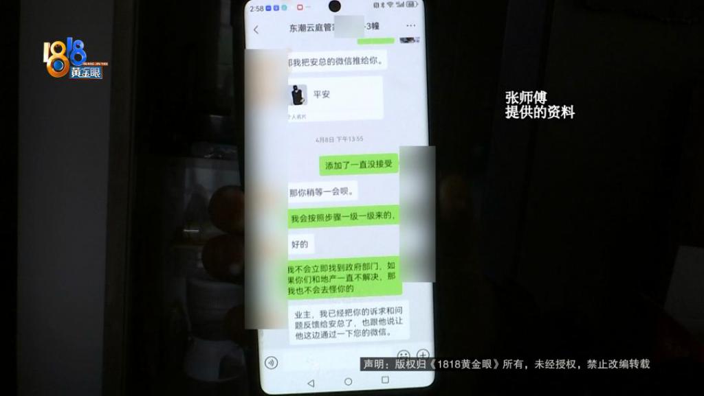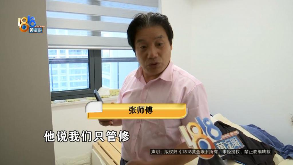 张师傅:他们房开的一个小年轻电话打过来,他说我们只管修,你修还是不修,就是这样你修还是不修?我没有不同意你修,第一我柜子破坏了,我衣服发霉了,你们总要给我一个说法嘛,把我这里修好。(如果)柜子拆掉了,你们把我做好。