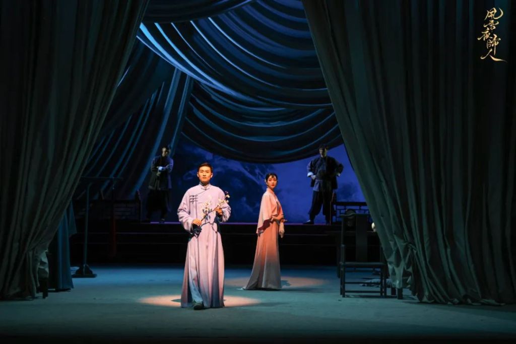 在《风雪夜归人》的二度创作中,主创团队以剧本本身蕴含的“诗境美”为支点,着力激发东方传统美学的当代生命力。冯远征指出:“我们首先要在视觉上让观众感受到纯粹的美。”为此,舞台设计摒弃了繁复的具象场景和高科技手段,转而从中国传统戏曲中汲取灵感,主要以软景构建写意空间。不同于戏曲的“守旧”,层层垂落的纱幔打造出轻盈、空灵、干净的意象,戏曲舞台上常用的“一桌二椅”作为主要道具,与随剧情流动的轻薄幔帐、倒悬的枯树虬枝、简约的中式围栏、典雅的月亮门等组成院落、戏台和书房等场景,辅以光影打造出不同时空,赋予凝练简洁的舞台以“东方诗境美”。