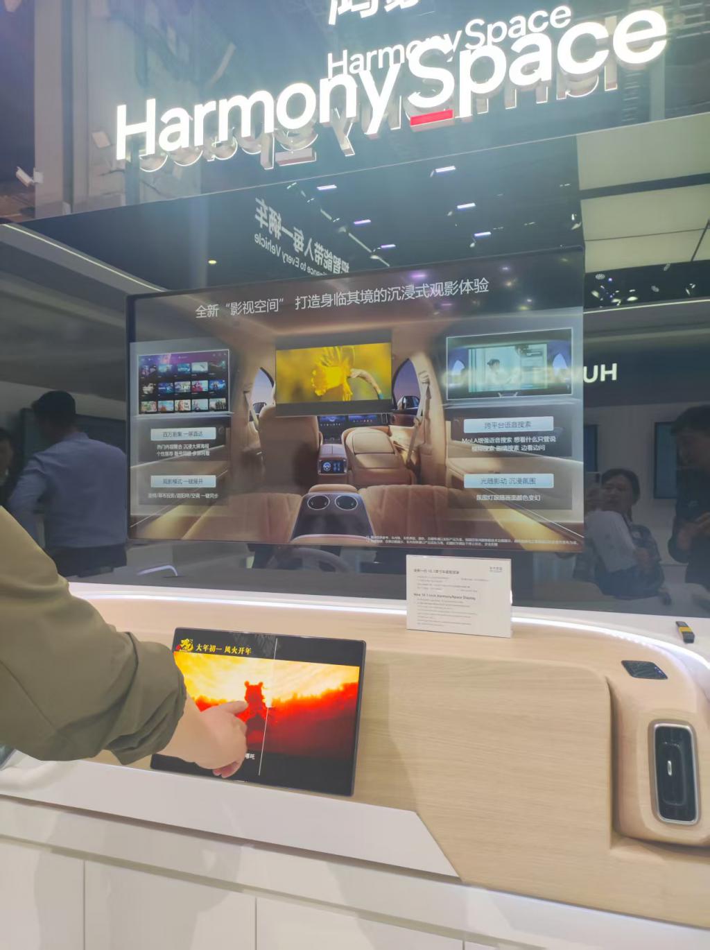 (新一代鸿蒙座舱的车载智慧屏支持跨平台搜索 财联社记者拍摄)