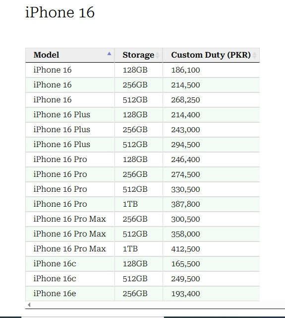 巴基斯坦海关估价总局(Directorate General of Customs Valuation)为187款苹果手机的进口设定了新的海关价格,其中包括最近推出的iPhone 16。