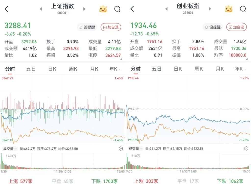 至收盘,上证综指跌0.2%,报3288.41点;科创50指数跌0.17%,报1002.83点;深证成指跌0.62%,报9855.2点;创业板指跌0.65%,报1934.46点。