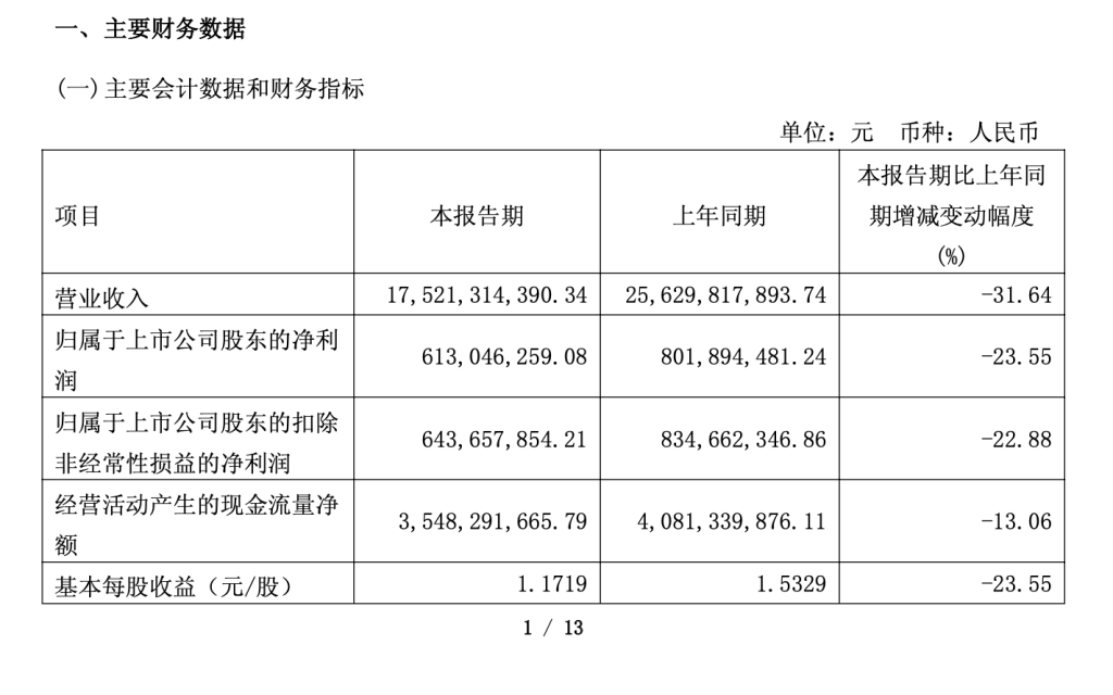 4月28日,老凤祥股份有限公司(老凤祥,600612)发布2024年年报和2025年一季度财报。一季度报显示,老凤祥营业收入175.21亿元,同比减少31.64%;归属于母公司所有者的净利润6.13亿元,同比减少23.55%;基本每股收益1.1719元,同比减少23.55%。