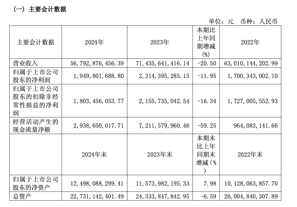 老凤祥年报显示,2024年,公司实现营业收入567.93亿元,同比降低20.50%;归属于上市公司股东的净利润19.50亿元,同比降低11.95%;基本每股收益3.7273元,同比下降11.95%。老凤祥还披露了2024年年度权益分派预案,拟每10股派17.2元,合计派发现金红利9亿元。