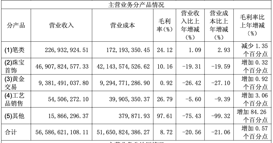 从年报各业务线表现来看,珠宝首饰、黄金交易是老凤祥营收占比最高的两大业务,去年珠宝首饰营收约469.08亿元,同比下降19.31%;黄金交易营收93.81亿元,同比下降26.42%。