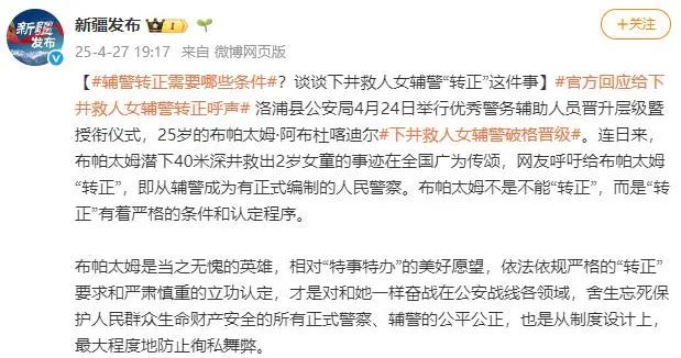 在舆论场上,布帕太姆的事迹引发广泛讨论。网友称赞其英勇事迹的同时,也呼吁给布帕太姆“转正”,即从辅警成为有正式编制的人民警察。对此,4月27日,“新疆发布”发文,向公众解释了当前辅警“转正”的政策背景和相应情况。