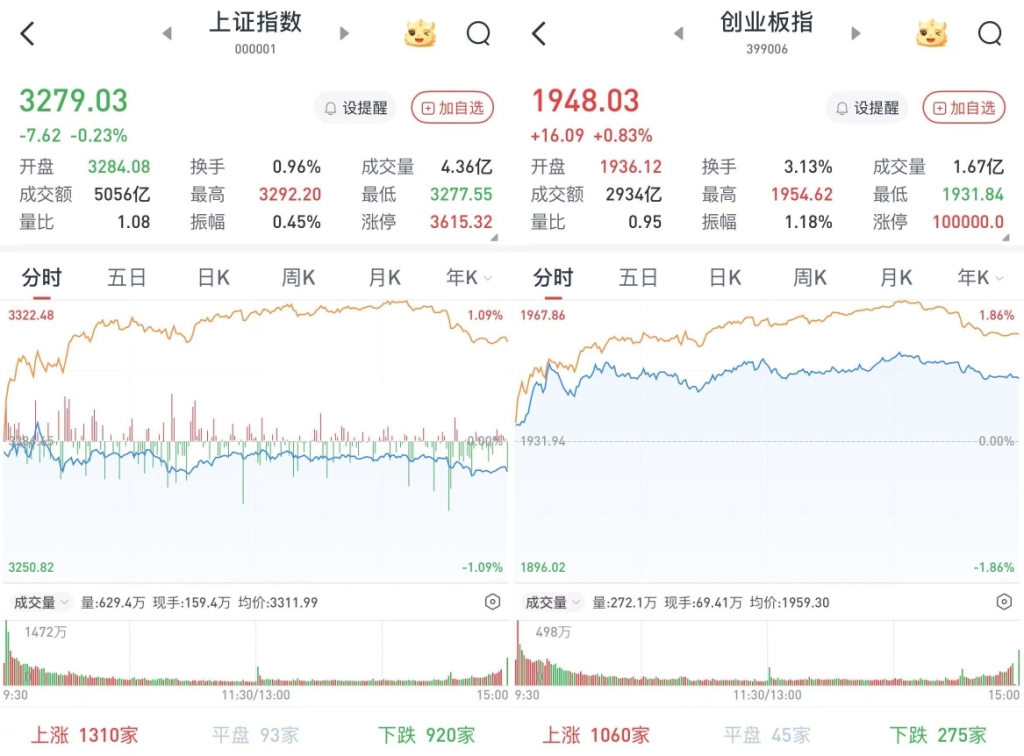 至收盘,上证综指跌0.23%,报3279.03点;科创50指数涨0.85%,报1012.42点;深证成指涨0.51%,报9899.82点;创业板指涨0.83%,报1948.03点。