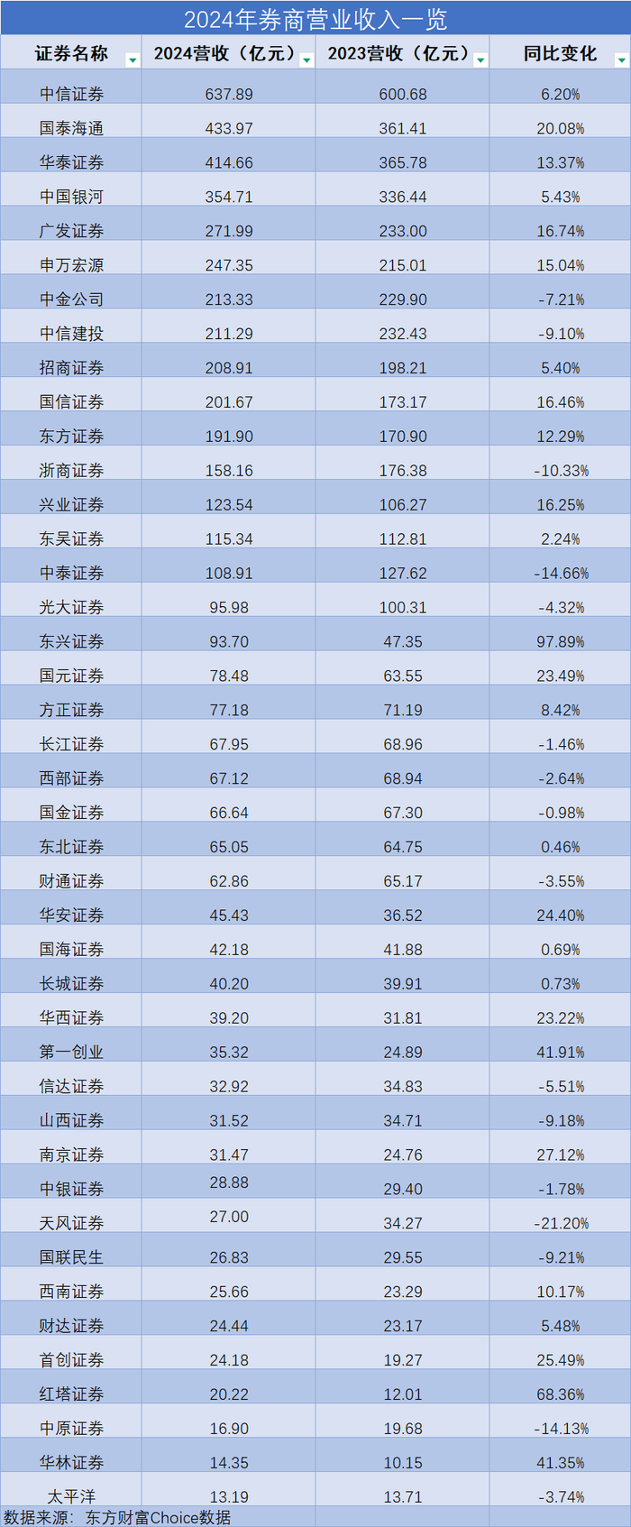 截至2025年4月29日,所有42家上市券商业绩已经全部披露完毕。其中,28家实现营业收入同比增长,占比70.37%。其中,中信证券(600030.SH)以637.89亿元位居榜首,国泰海通(601211.SH)、华泰证券(601688.SH)分列第二、三位,分别为433.97亿元、414.66亿元。