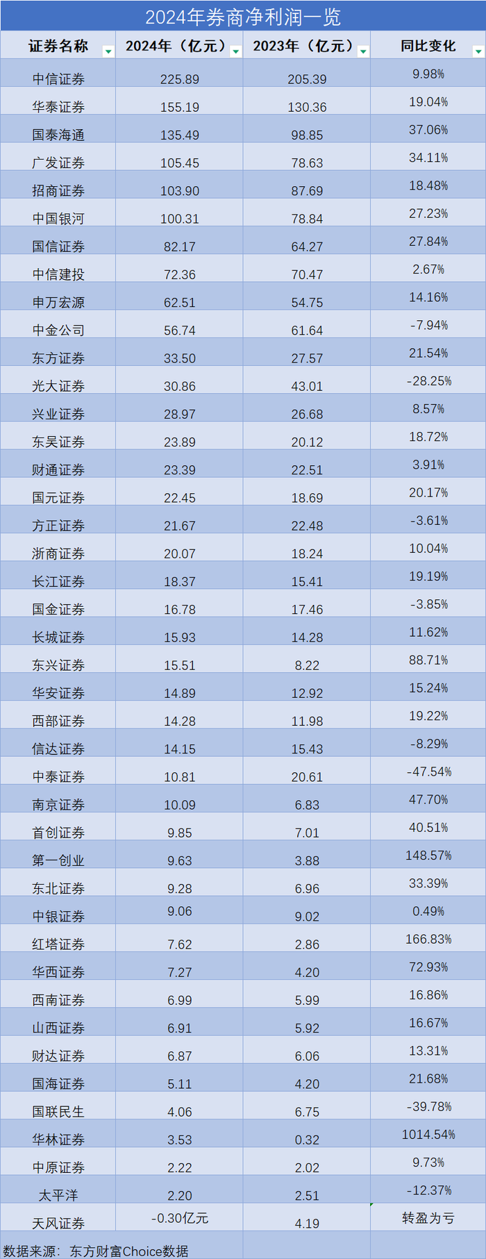 也有中原证券(601375.SH)、东海证券、华林证券(002945.SZ)净利润不足20亿元。此外,中泰证券(600918.SH)、信达证券(601059.SH)和国联民生(601456.SH)的净利润出现同比下滑。