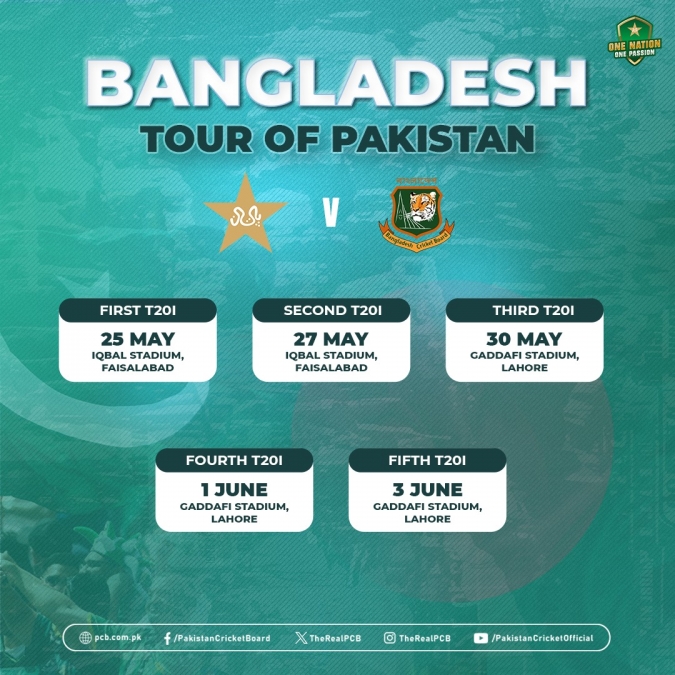 巴基斯坦板球委员会(PCB)证实,孟加拉国将于5月前往巴基斯坦参加五场T20I系列赛,费萨拉巴德的伊克巴尔体育场将在17年来首次举办国际板球比赛。