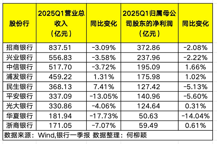 一季报数据显示,9家股份行中,7家营业收入出现同比下滑。