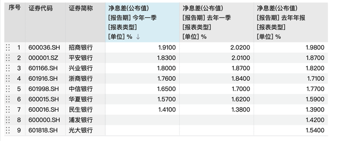 另外,招商银行净息差为1.91%、平安银行净息差为1.83%、兴业银行为1.80%。