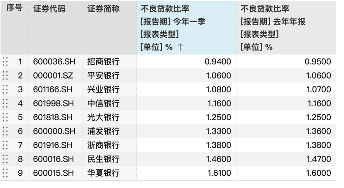 不良贷款率环比所下降的还有浦发银行,一季度不良率为1.33%,较去年末下降了0.03个百分点;以及民生银行,一季度不良率为1.46%,较去年末下降了0.01个百分点。