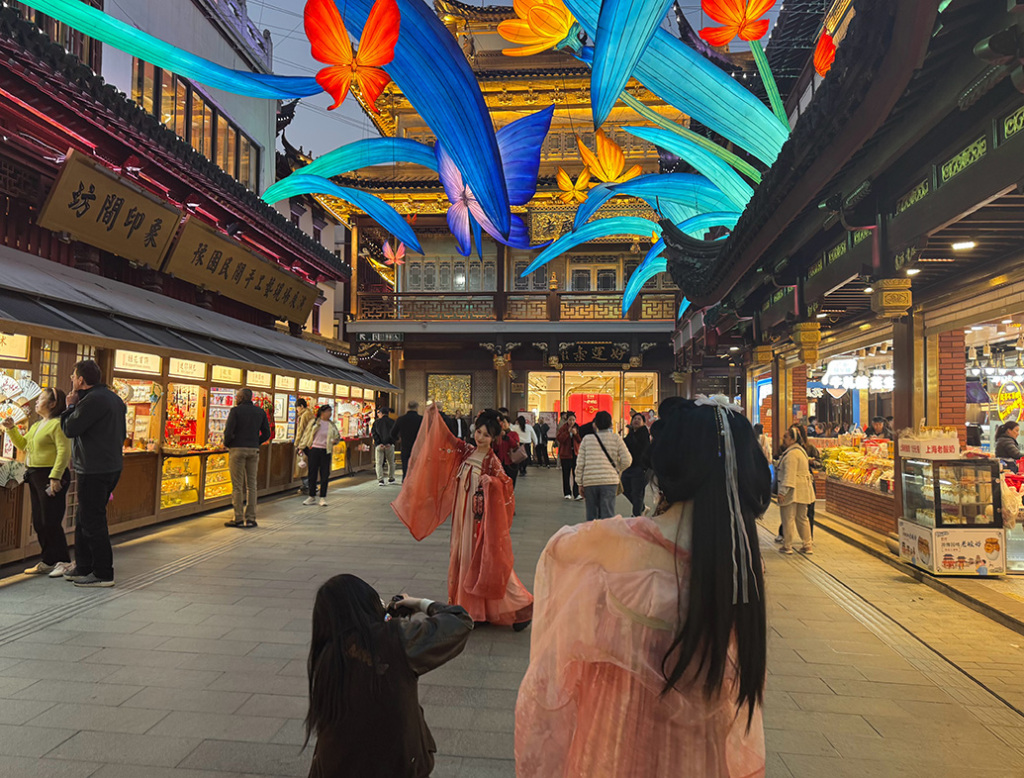 在刚刚过去的仲春花朝节里,古色古香的明清建筑、美轮美奂的华彩灯影搭配现代商业设施,打造出了沉浸式国风消费场景。记者探访时发现,夜幕降临时,无论是在被誉为“中式美学天花板”的凝晖路,还是在不定时演绎国风舞蹈和古乐的中心广场和黄金广场,穿着汉服的游人不在少数。记者采访发现,其中外国游客的比例甚高。