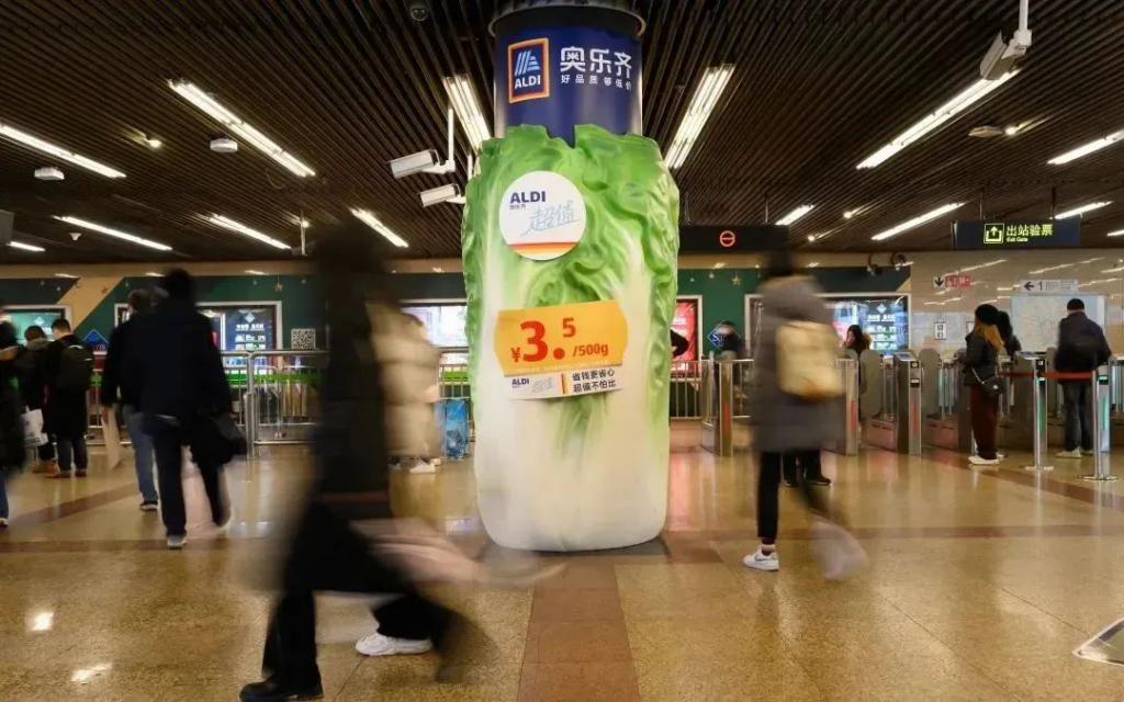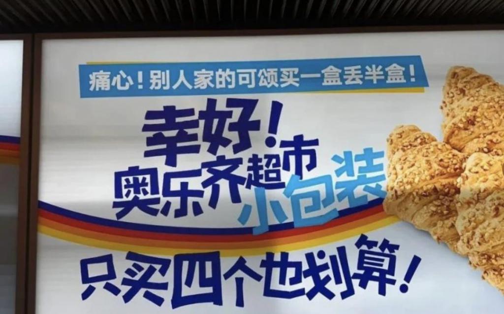 在此之前,奥乐齐还在上海地铁静安寺站上演大型阴阳现场:一边用大字宣传奥乐齐小份更新鲜,一边用小字内涵,逛超市不必买门票。文案上 " 隔壁家的瑞士卷 "" 别人家的可颂 ",指向性不要太明显。
