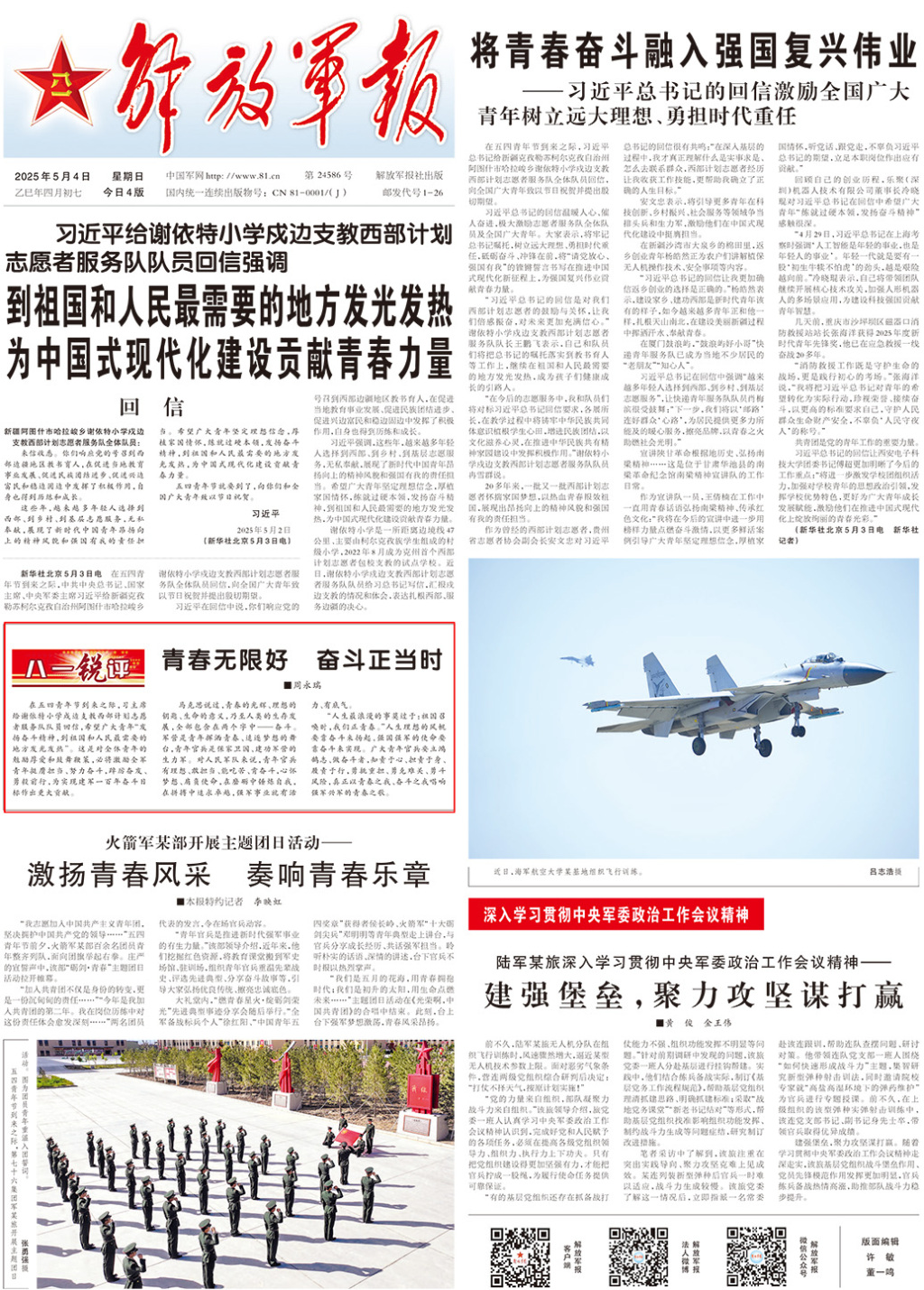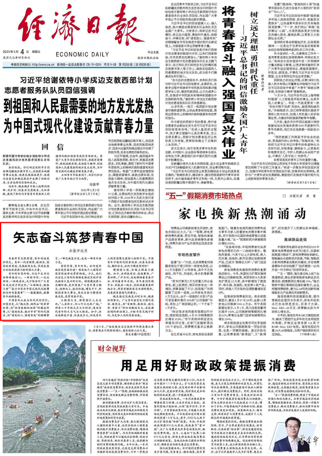 5月4日出版的《人民日报》《新华每日电讯》《解放军报》《光明日报》《经济日报》等主要央媒均在头版刊文,新时代的青年们都能找到属于自己的生长节奏,在青春的赛道上书写各自闪耀的篇章。