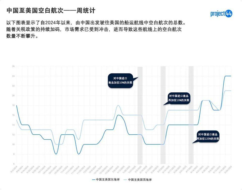 该公司表示:" 东海岸预计 5 月最后一周出现 24 个空白航次的峰值,较 2 月新关税政策实施以来增长 100%;西海岸紧随其后,达到 21 个,增长了 31%。"