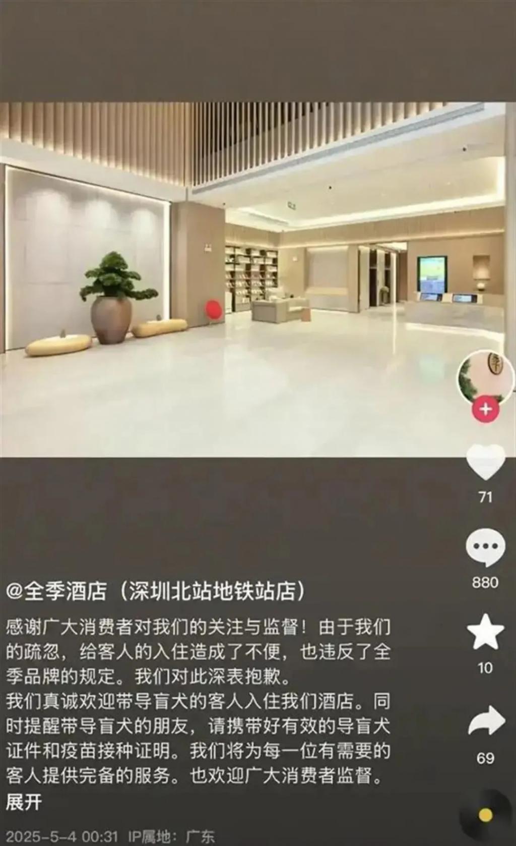 5 月 4 日凌晨,全季酒店深圳北站地铁站门店发布道歉公告,称由于疏忽,给客人的入住造成了不便,也违反了品牌的规定,对此深表抱歉,真诚欢迎带导盲犬的客人入住该酒店。
