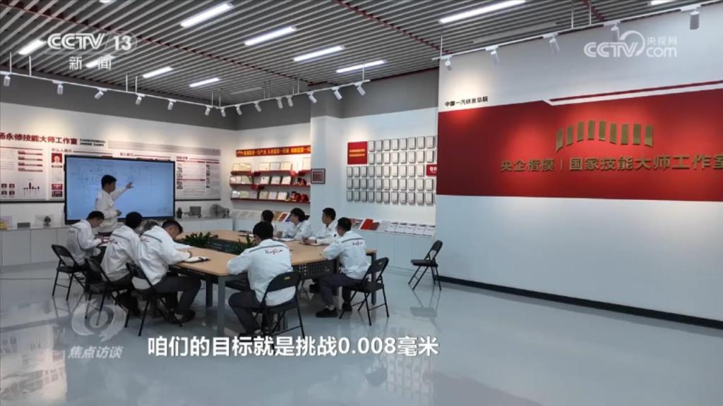 全国劳动模范、中国一汽集团首席技能大师、研发总院试制部高级技师杨永修:" 大直径的中心线和下面深孔的中心线要同心,同心尺寸是 0.008 毫米,之前没有遇到过这样一个大尺寸加工。"