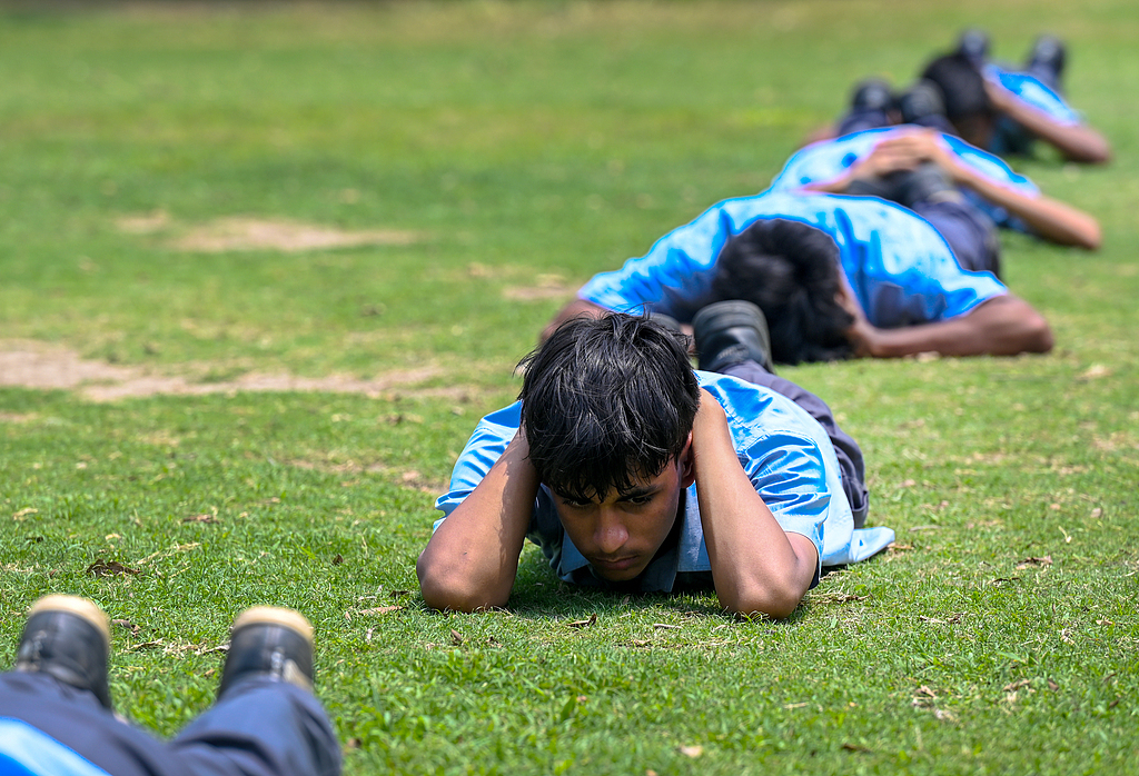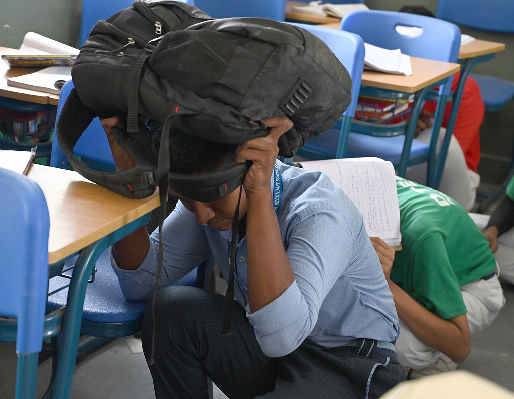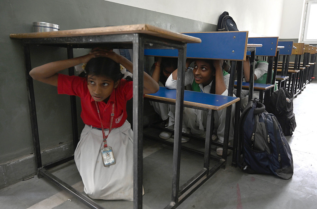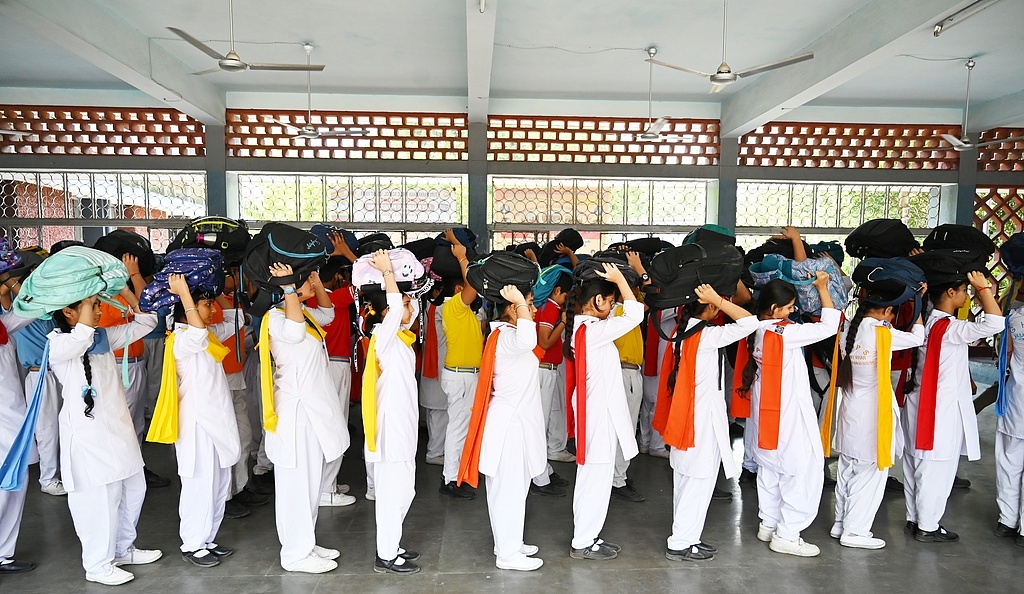 当地时间2025年5月7日,印度诺伊达,学生们参加在44区阿米蒂学校由地区学校检查员(DIOS)组织的民防演习。