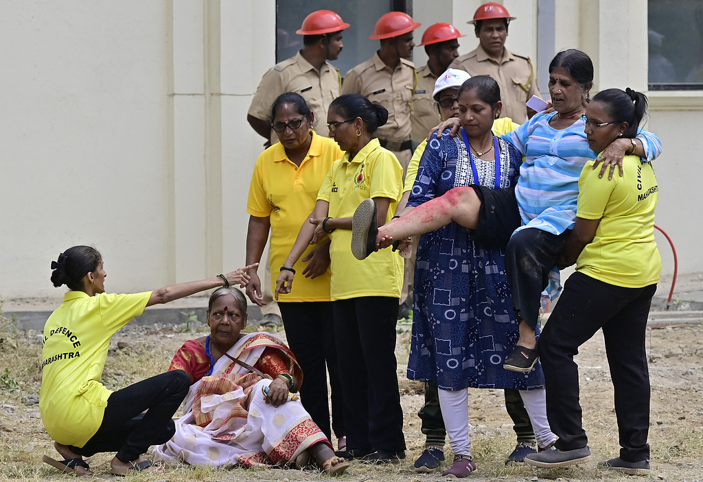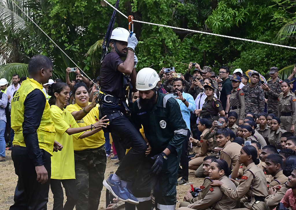 当地时间2025年5月7日,印度孟买,民防服务部门、国家灾害响应部队(NDRF)和孟买消防队在海洋线的民防场地进行模拟演习,按照内政部的指导进行。