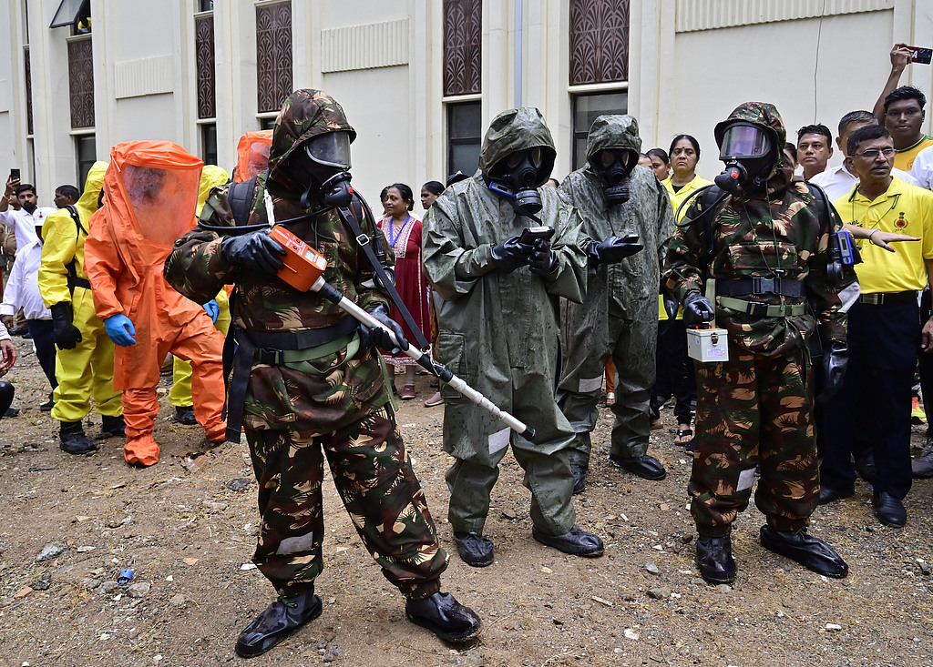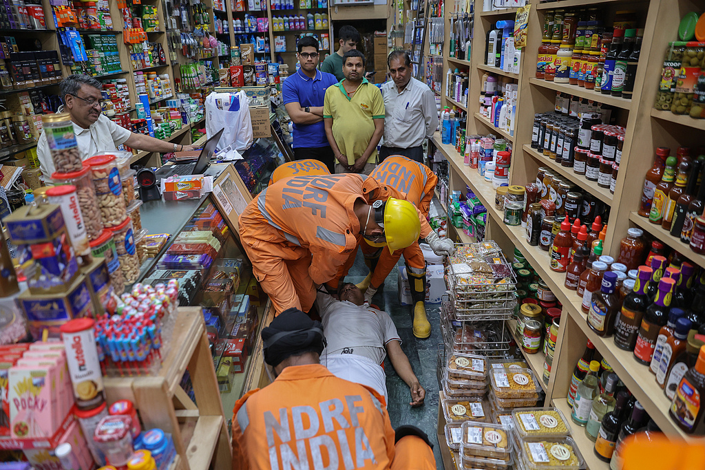 当地时间2025年5月7日,印度新德里,国家灾害响应部队(NDRF)、民防和消防人员在汗市场举行空袭演习。