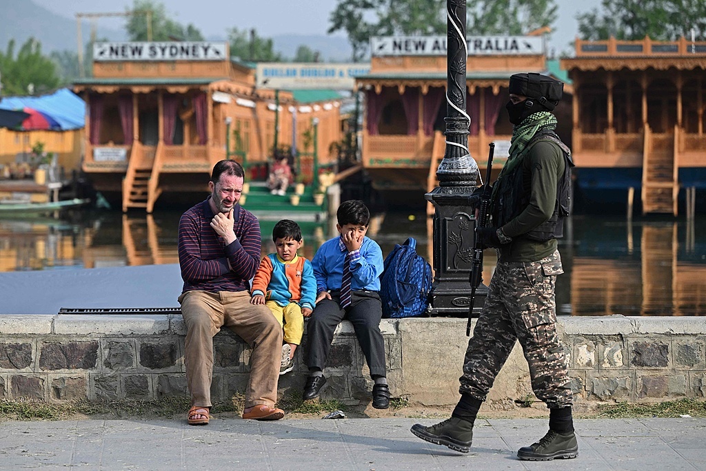 当地时间2025年5月7日,印控克什米尔, Kashmiri一家人坐在达尔湖边,印度准军事人员在巡逻。在同一天,印度和巴基斯坦在有争议的边界地区发生了激烈的炮火交火,印度新德里在向其对手发起导弹攻击后,局势发生了重大升级。新德里宣布在巴控克什米尔的九个地点进行了“对恐怖分子营地的精确打击”,几天前,印度指责伊斯兰堡应对在争议地区印度控制的一侧发生的致命攻击负责。